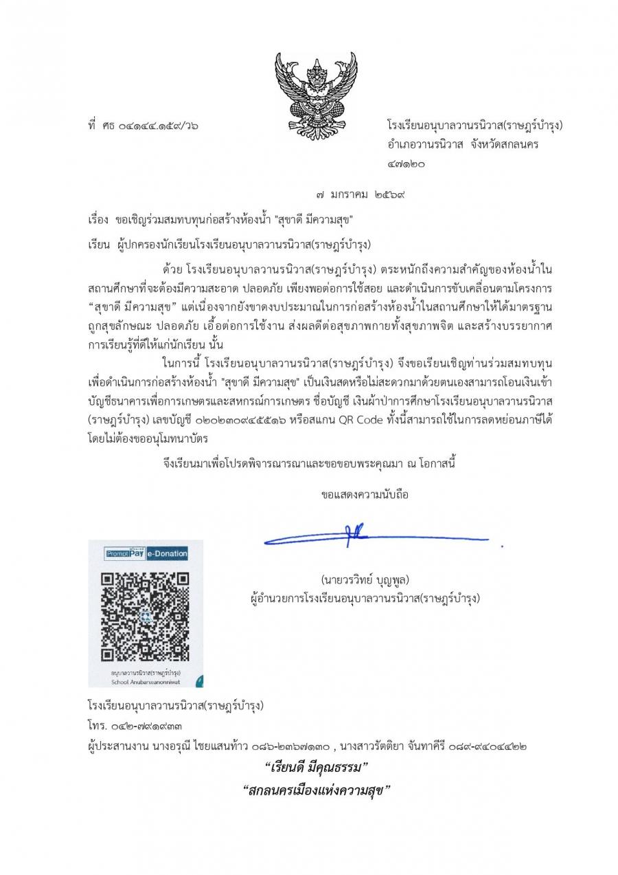 ขอเชิญร่วมสมทบทุนก่อสร้างห้องน้ำ "สุขาดี มีความสุข" โรงเรียนอนุบาลวานรนิวาส(ราษฎร์บำรุง)