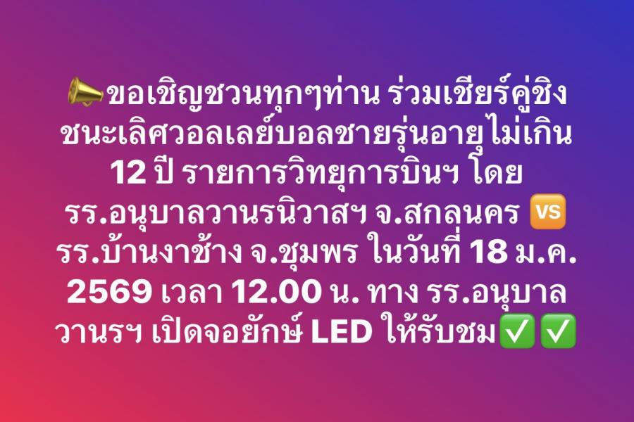 ร่วมชมถ่ายทอดสดวอลเลย์บอลนัดชิงชนะเลิศ ผ่านจอยักษ์ LED ณ หอประชุมโรงเรียนอนุบาลวานรนิวาส(ราษฎร์บำรุง) วันอาทิตย์ที่ 18 มกราคม 2569 เริ่มแข่งนัดชิงเวลา 12.00 น.
