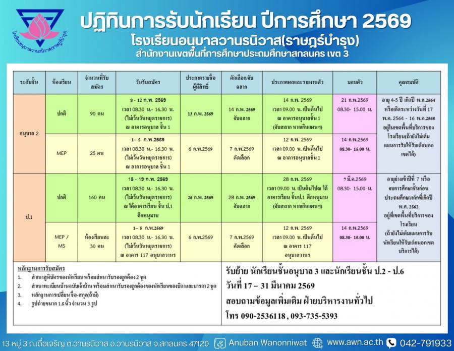 ประกาศรับสมัครนักเรียนห้องเรียนปกติ ปีการศึกษา 2569