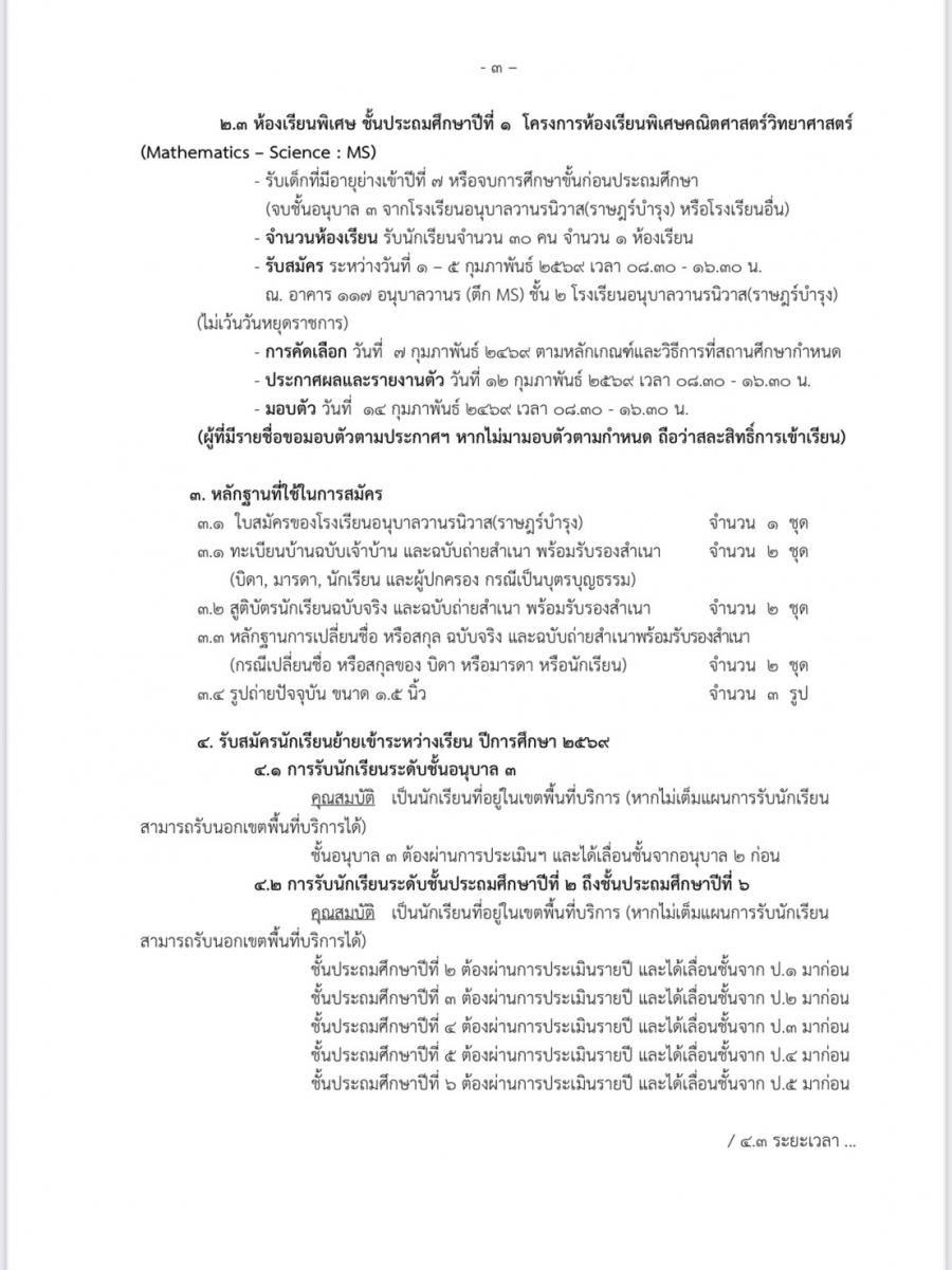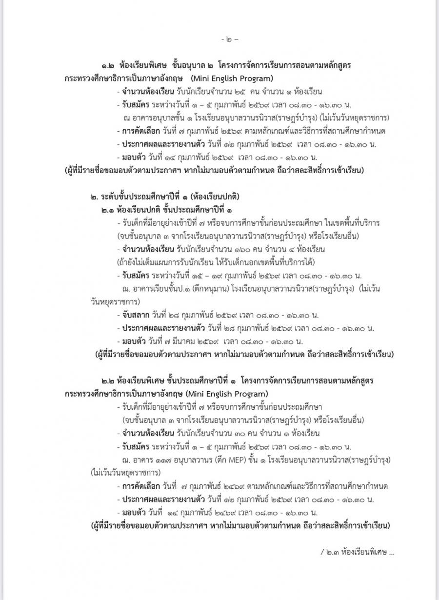 ปฏิทินการรับนักเรียนสำหรับรับสมัคร นักเรียนอนุบาลห้องเรียนปกติ ปีการศึกษา 2569