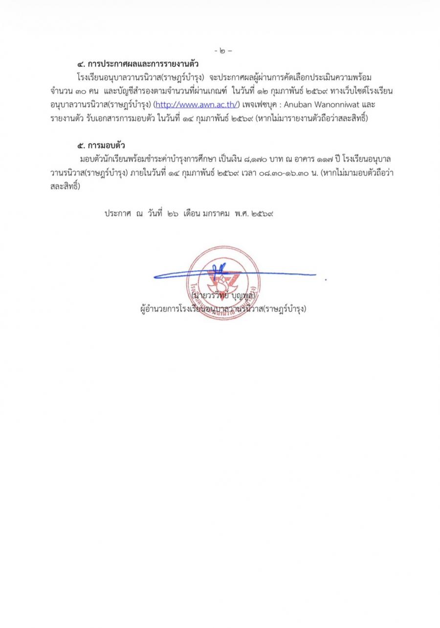 ปฏิทินการรับนักเรียนสำหรับรับสมัคร นักเรียนอนุบาลห้องเรียนปกติ ปีการศึกษา 2569