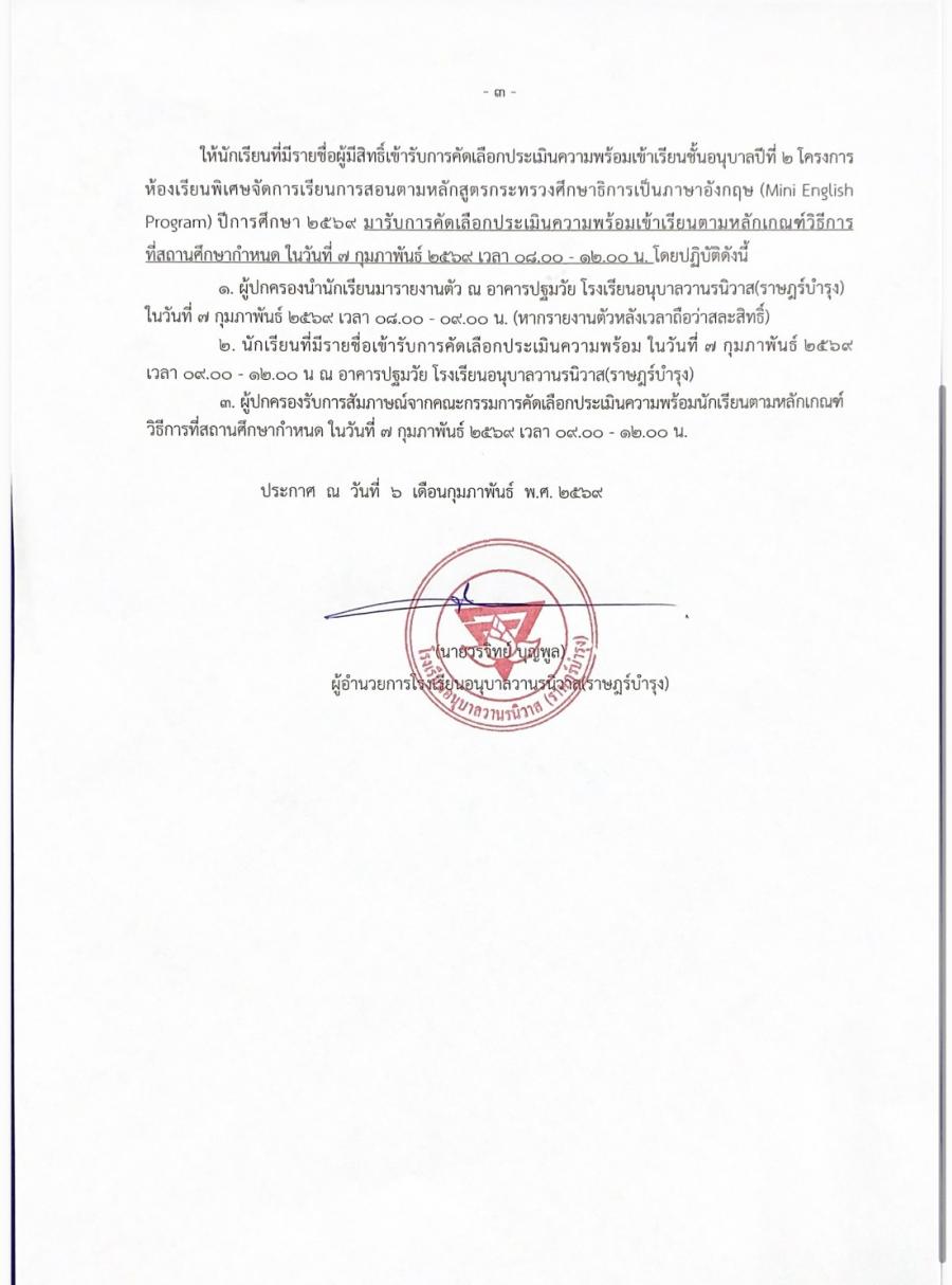 ประกาศรายชื่อนักเรียนผู้มีสิทธิ์เข้ารับการคัดเลือกประเมินความรพ้อมเข้าเรียน ชั้นประถมศึกษาปีที่ 1 MEP ปีการศึกษา 2569